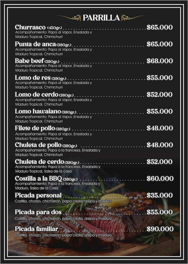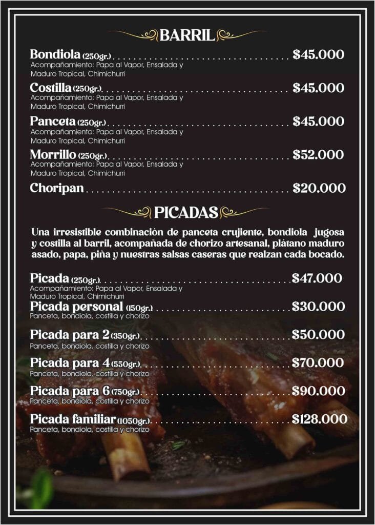 Especialidades al Barril y Parrilla: La joya de la corona es su cocina al barril. Cortes como la Bondiola, la Costilla y la Panzeta de cerdo, junto al tierno Morrillo de res, se cocinan lentamente para garantizar jugosidad extrema. Además, ofrecen cortes premium a la parrilla como Tomahawk, Churrasco y Punta de Anca.