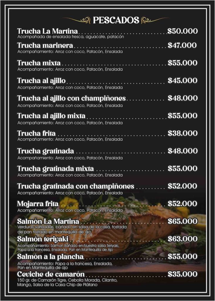 Tradición Quindiana y Pescados: Honran la cocina local con una Bandeja Paisa impecable, Sancocho de Espinazo y Mondongo. Al estar cerca de Salento, la Trucha fresca es protagonista en preparaciones como la Trucha La Martina (especialidad), al ajillo o marinera.
