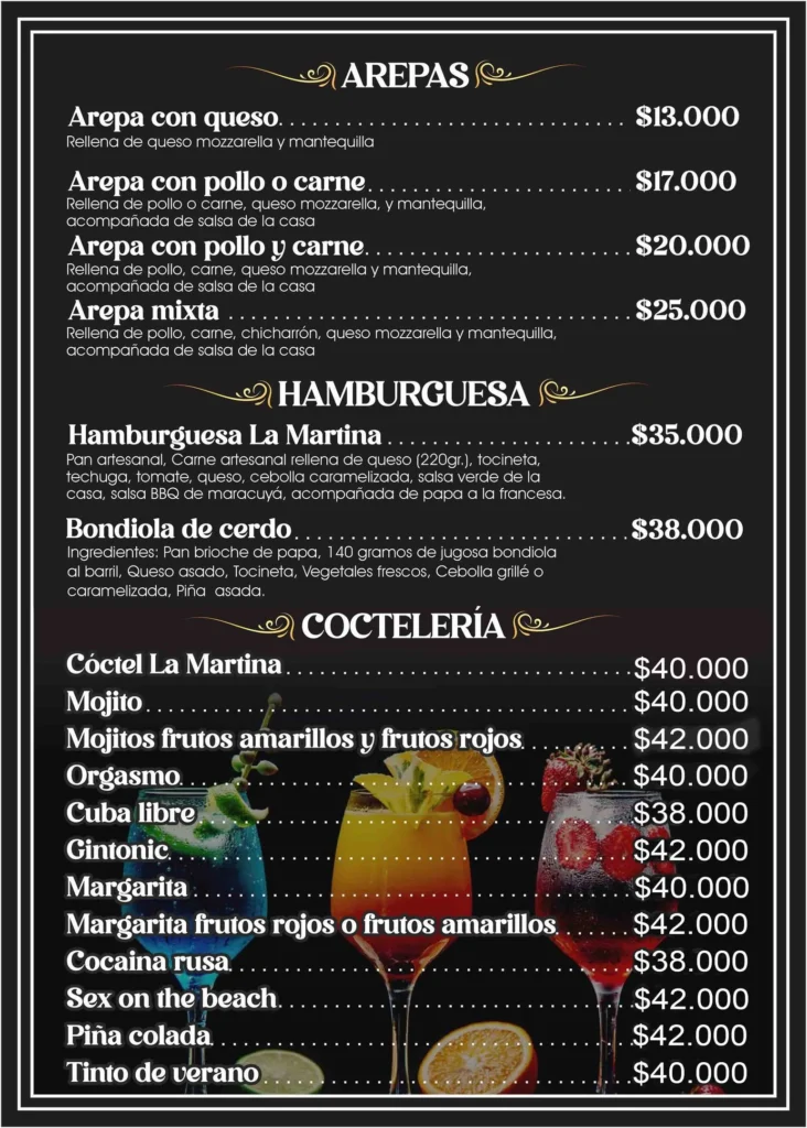 Café de Origen y Coctelería: Disfruta de un auténtico café quindiano o de una variada carta de licores y cocteles, incluyendo su famoso Cóctel La Martina, ideal para acompañar el atardecer en Boquía.