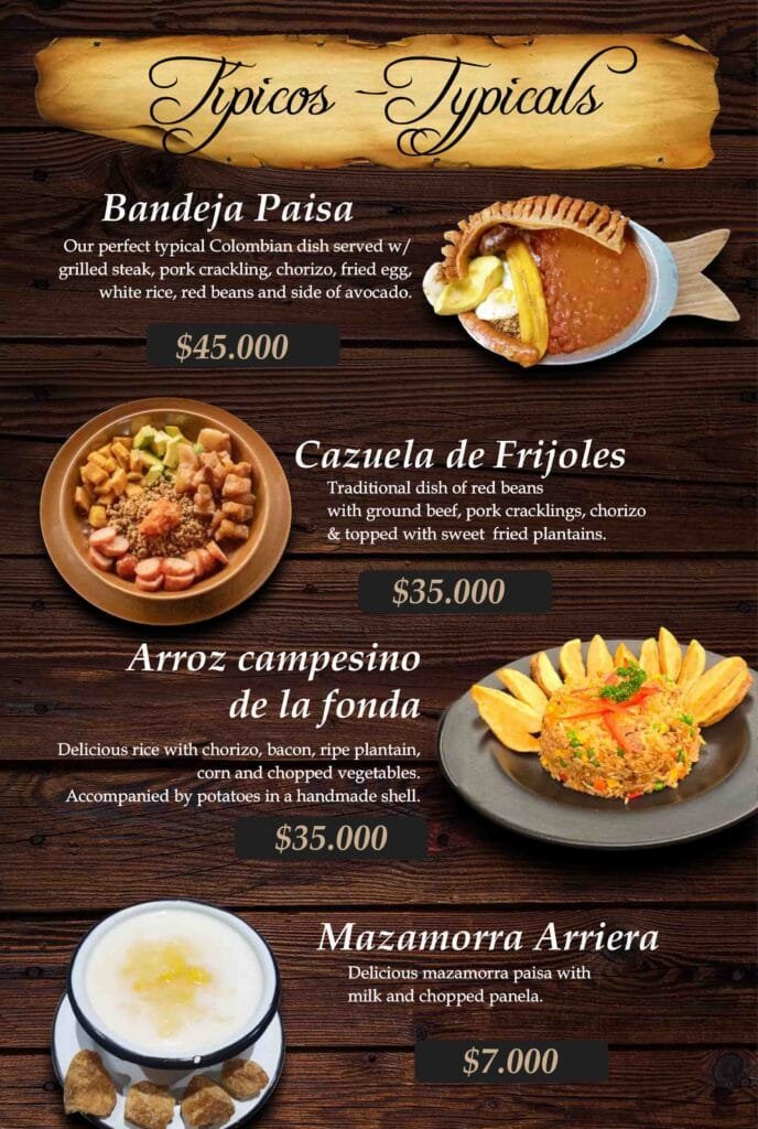 La carta se centra en platos que representan la riqueza de la cocina colombiana y los sabores de la región:
